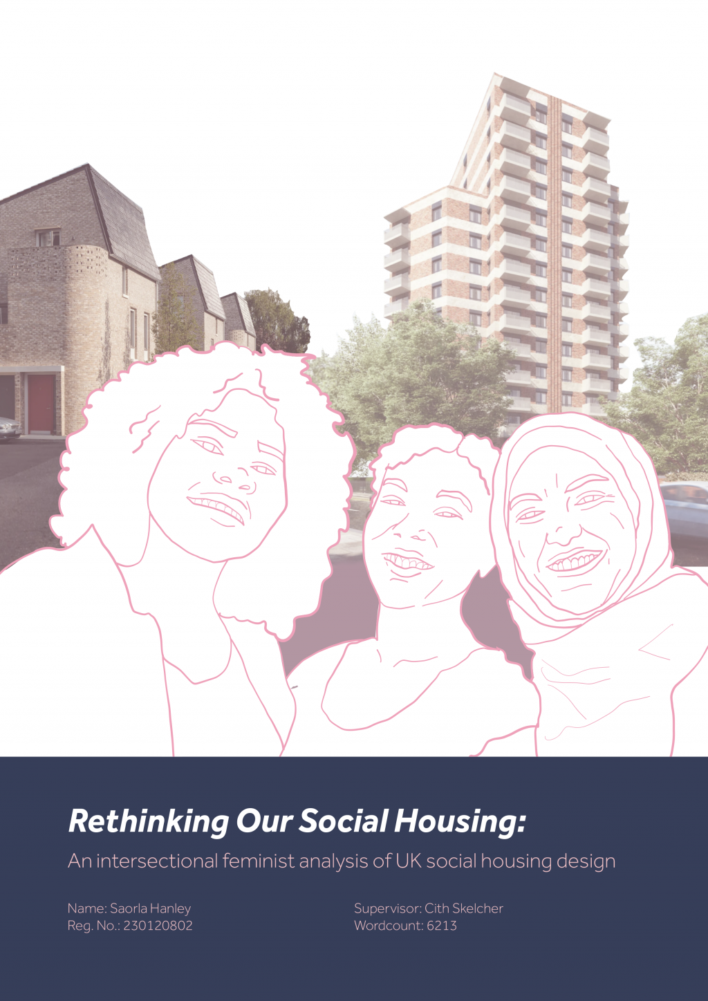 Abstract: Facing the 2024 Labour government’s new housing targets, this dissertation seeks to investigate how architects can design social housing to better suit the needs of women in the UK through an intersectional feminist lens. Beginning by exploring the problems posed by the current housing crisis, the dissertation homes in on the specific problems faced by women in this context. Following analysis of historical and contemporary approaches to women-centred design, the study then evaluates two case studies: the pioneering Goldsmith Street in Norwich and Brook House in Ealing, the first purpose-built women-only social housing in the UK. This aims to examine current design processes and outcomes, addressing women’s issues that are neglected in housing design. Two interviews with industry professionals (one an architect based in Glasgow and the other a social housing governance assistant in Newcastle) about the issue of feminist design and the challenges faced by social housing architects then embed the study within practice. This culminates in an ‘alternative design guide’ which recommends the employment of participatory methods, iterative design and active advocation for intersectional feminist ethos in the next wave of social housing in the UK.